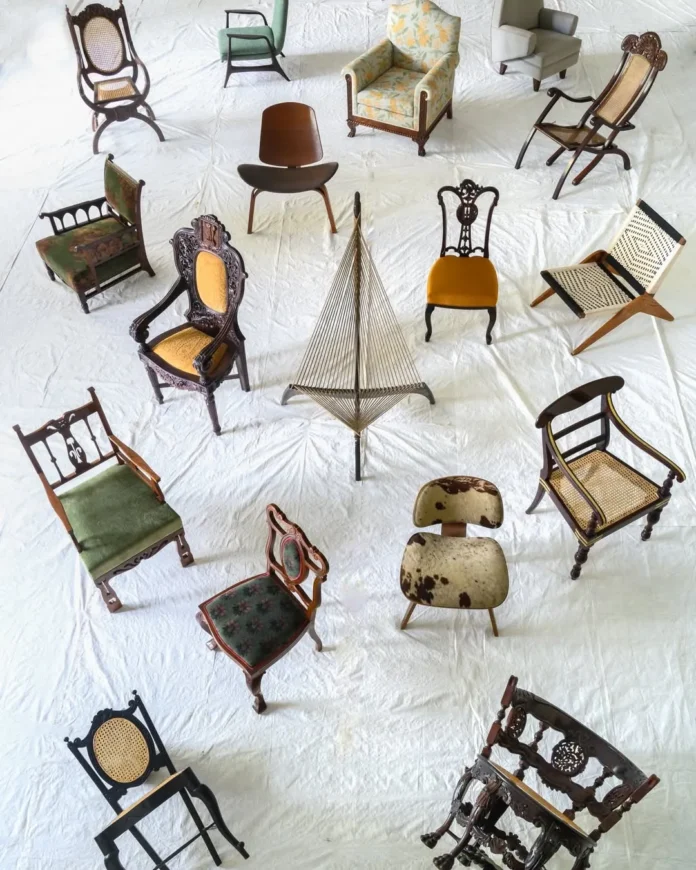 The show takes place at the Mahendra Doshi warehouse in Wadala, where visitors walk through clusters of seating from different eras. Around 200 to 250 chairs from the family’s vast collection have been arranged to reflect roughly two centuries of design in the subcontinent.