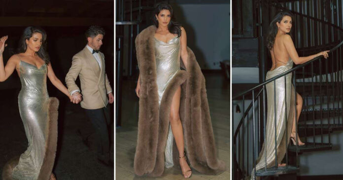 Priyanka also shared some clicks with Nick Jonas and captioned the post as, “Our very own after party.. [kiss emoticon]. As for her ensemble, she donned a Stella McCartney dress in the liquid gold colour with Jimmy Choo sandals. The shimmering outfit featured a backless design and a thigh-high slit with fur detailing.