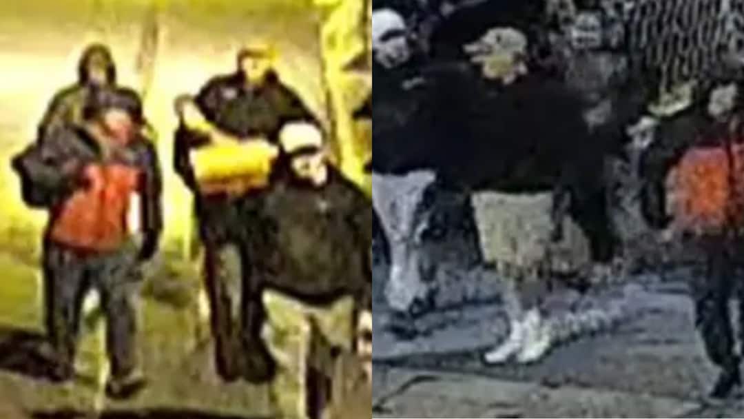 The newly released images show four white male suspects wearing distinctive clothing. One appears in a white cap, black jacket, light trousers, and black trainers; another wears a grey hooded jacket with black trousers and black trainers. A third man is seen sporting a green cap, black jacket, light shorts, and white trainers. The fourth suspect, described as larger-built, is dressed in a two-toned orange and navy/black puffed jacket, black trousers, and black-and-white trainers.