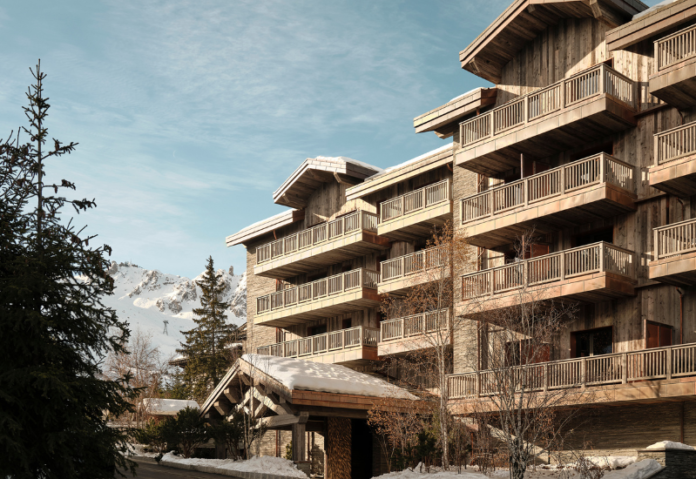 Interiors are by Tristan Auer, who draws on Courchevel’s early days in the 1940s and 1950s to create a chalet aesthetic that feels both nostalgic and elevated. Natural materials take centre stage throughout: the exterior pairs quartzite from Vals in Switzerland with warm wood and copper detailing, while a hand-carved timber entrance sets the tone for what lies within. It’s a look that carries through the entire property, including the rooms.