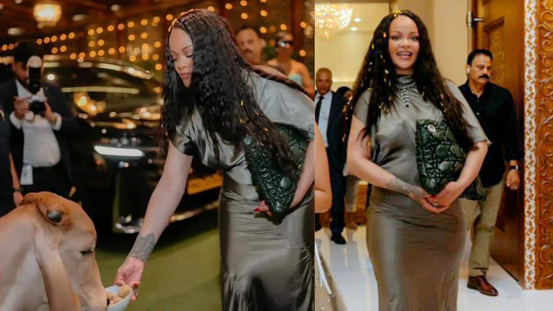 During her high-profile stay in India for a private event at the Ambani estate, Rihanna was seen feeding a cow outside the residence Antilia.