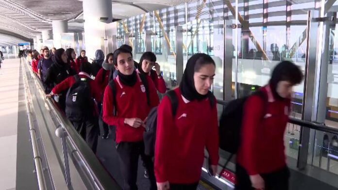La squadra di calcio femminile dell’Iran all’aeroporto di Istanbul prima di imbarcarsi per Teheran. Le calciatrici erano state protagoniste di gesti di protesta prima (non avevano cantato l’inno nazionale prima di una gara ) e poi prima di ripartire manifestare l’intenzione di fare richiesta d’asilo alle calciatrici ( Cinque atlete erano sfuggite ai controlli e aveva presentato la domanda, ma poi l’avevano ritirata). Secondo quanto riferito dai funzionari, la squadra ha viaggiato dall’Australia alla Malesia, poi in Oman, prima di raggiungere la Turchia. Il segretario generale della Federazione Calcio Asia, Datuk Seri Windsor John, aveva dichiarato di non essere a conoscenza dei piani di viaggio della squadra dopo l’Oman, poiché erano stati organizzati dall’ambasciata iraniana. “Abbiamo parlato con i dirigenti della squadra. Abbiamo parlato con gli allenatori, con il capo delegazione”, ha detto. “Le ragazze sono di ottimo umore. Non sono demotivate e non sembrano spaventate.”