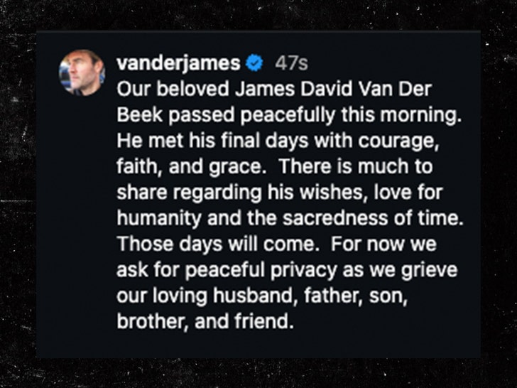 James’ wife, Kimberley Van Der Beek, posted about his shortly after we broke the news … writing in a shared Instagram post, telling fans her husband “met his final days with courage, faith, and grace.” She asked for privacy for their family at this time.