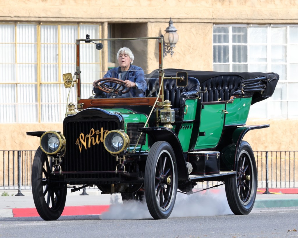 Leno was behind the wheel of his 1907 White Model G steam car, a 30-horsepower, brass-era touring machine built by the White Motor Company.