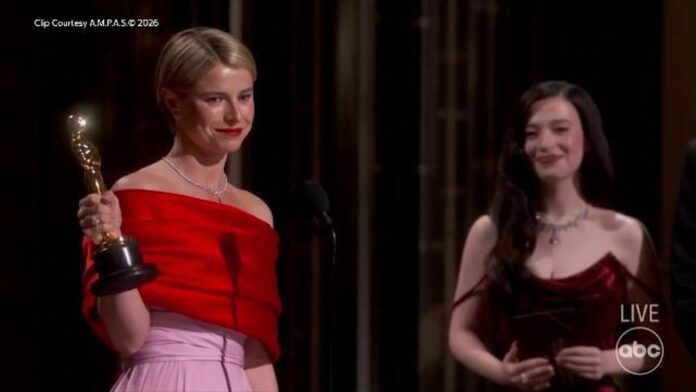 L’attrice irlandese Jessie Buckley ha vinto l’Oscar come miglior attrice protagonista per la sua interpretazione in Hamnet. Prima di salire a ritirare il premio, ha abbracciato il marito Freddie Sorensen, il co-protagonista Paul Mescal e la regista Chloé Zhao. Parlando sul palco, ha dichiarato: “Vorrei dedicare questo premio al meraviglioso caos del cuore di una madre. Veniamo tutti da una stirpe di donne che continuano a creare contro ogni previsione. Grazie per avermi premiata in questo ruolo. È l’onore più grande.”