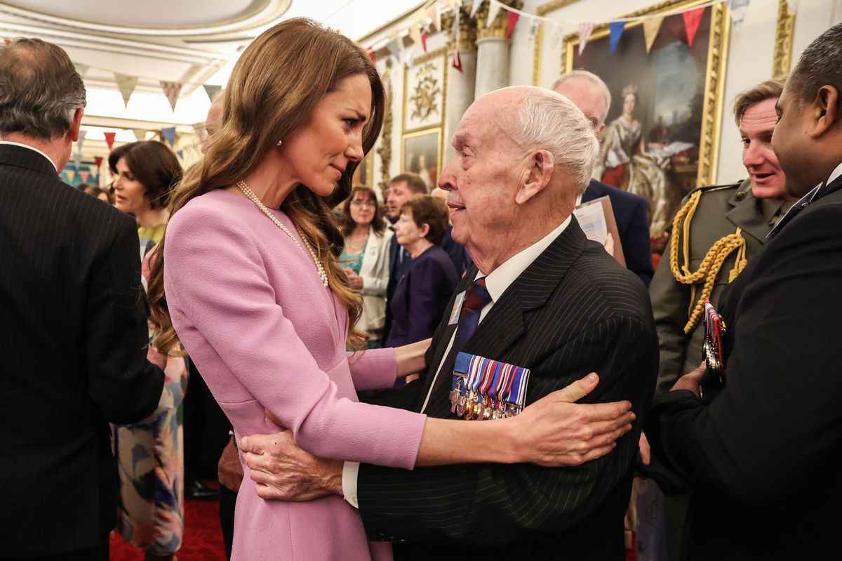 The Princess of Wales hugged former Metropolitan Police Officer Tony Gledhill, who was among the hundreds of guests at Buckingham Palace today for a reception to mark 100 years since the birth of the late Queen