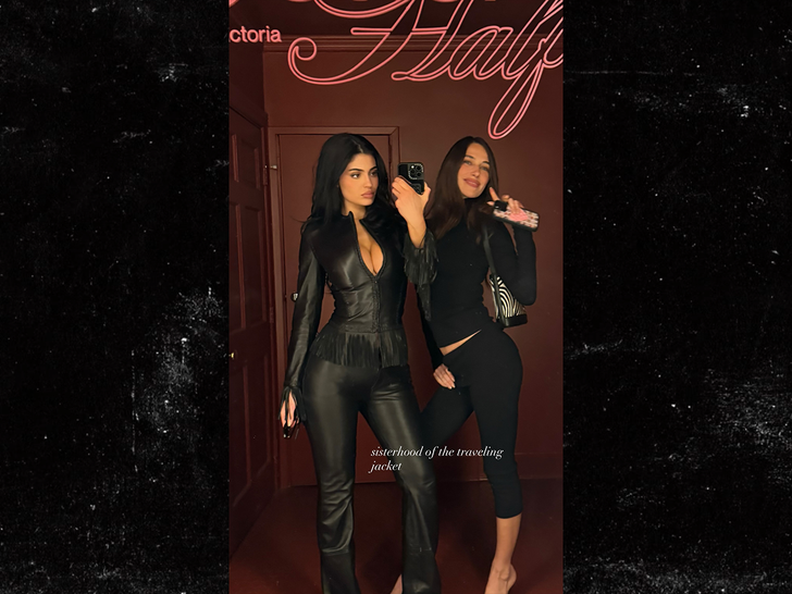 Check out the makeup mogul’s eye-popping mirror selfie with pal Devon Carlson … she framed her voluptuous chest in a tight leather jacket embellished with fun fringe … leaving the zipper open just enough to give a solid peek at her goods. She paired the top with curve-hugging flared pants and styled her hair in loose waves.