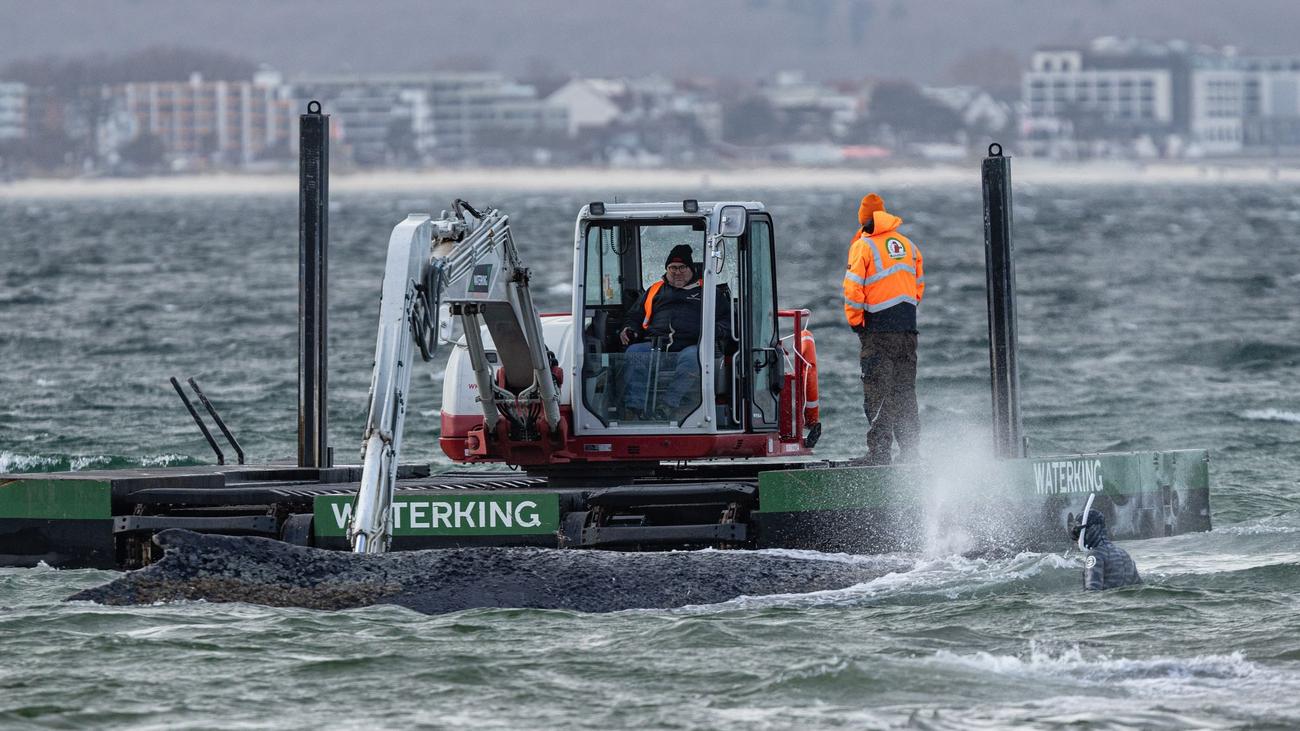 Stundenlang waren zuvor Bagger im Einsatz vom Wasser und von Land aus. Ein schwimmender Schaufelbagger hob eine Rinne aus. Ein weiterer Bagger schuf sich vom Strand aus einen Damm, um dichter an das Tier zu gelangen.