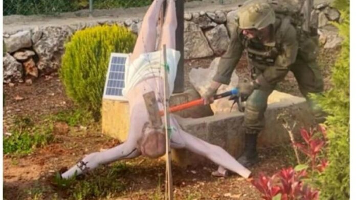 L’esercito israeliano ha dichiarato aver avviato un’indagine su un soldato fotografato mentre colpiva con un martello da demolizione una statua di Gesù nel sud del Libano.
