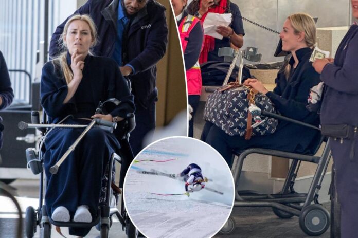 The new images of Vonn show her sitting in a wheelchair, being assisted by personnel at the airport as she sported a dark-colored, casual outfit for her trip.