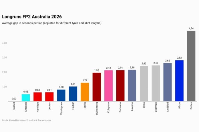 The fastest man in the long runs was clearly George Russell. The Briton was a massive 0.48 seconds per lap quicker than his Mercedes team-mate Kimi Antonelli and 0.6s ahead of the first Ferrari of Lewis Hamilton.