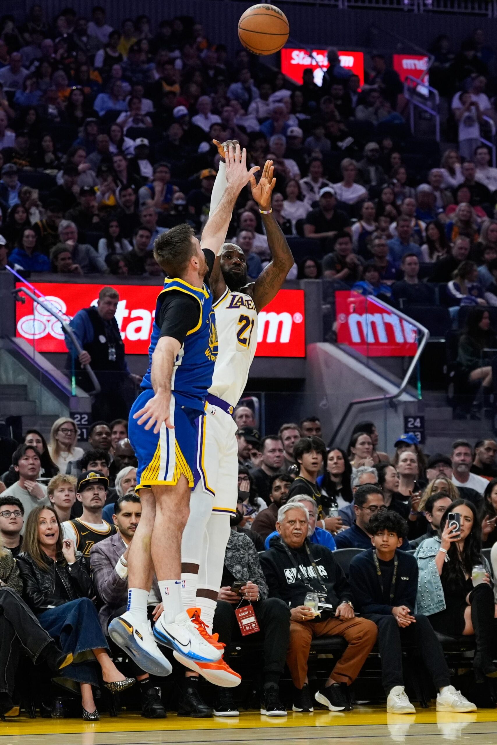 Lakers star LeBron James shoots a three-pointer over Golden State Warriors guard Pat Spencer in the first half Saturday.