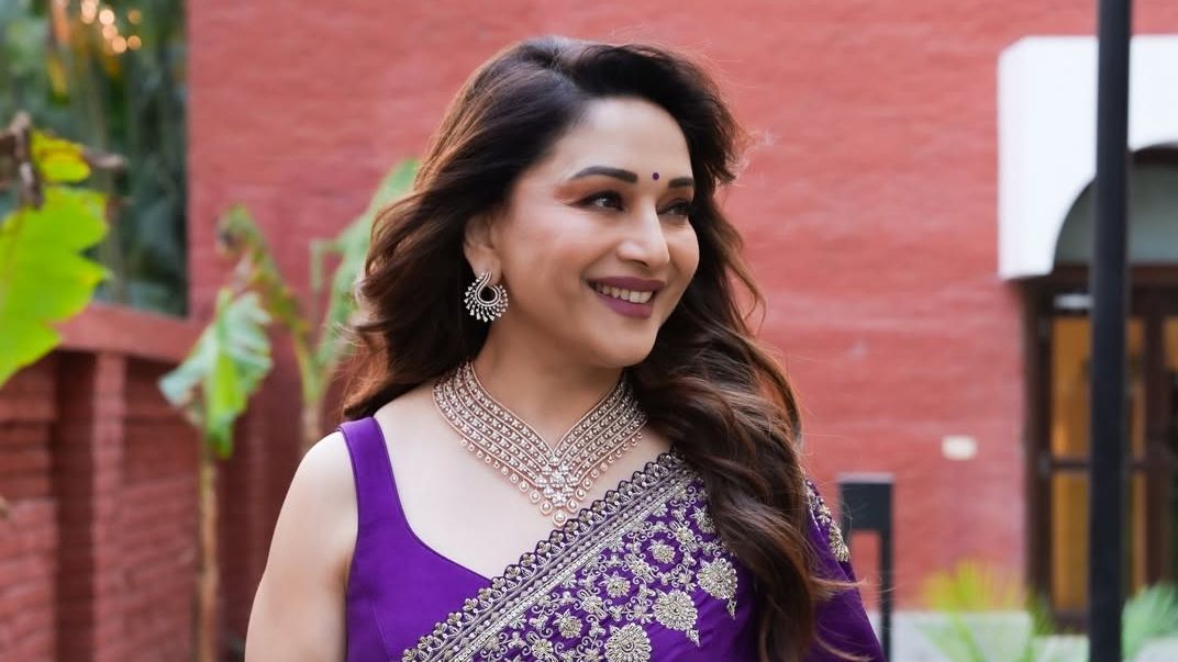 For the inauguration of PNG Jewellers in Varanasi, Madhuri Dixit Nene wore Mrunalini Rao’s purple silk Mahamayi sari, styled by Sukriti Grover. The sari’s strongest feature is its intricate linear zardozi border, set against a saturated purple silk base. She paired it with a sleeveless blouse in the same shade, cut with a wide neckline that left room for the jewellery. Silver wedges picked up on the sari’s metallic detailing without breaking the palette.