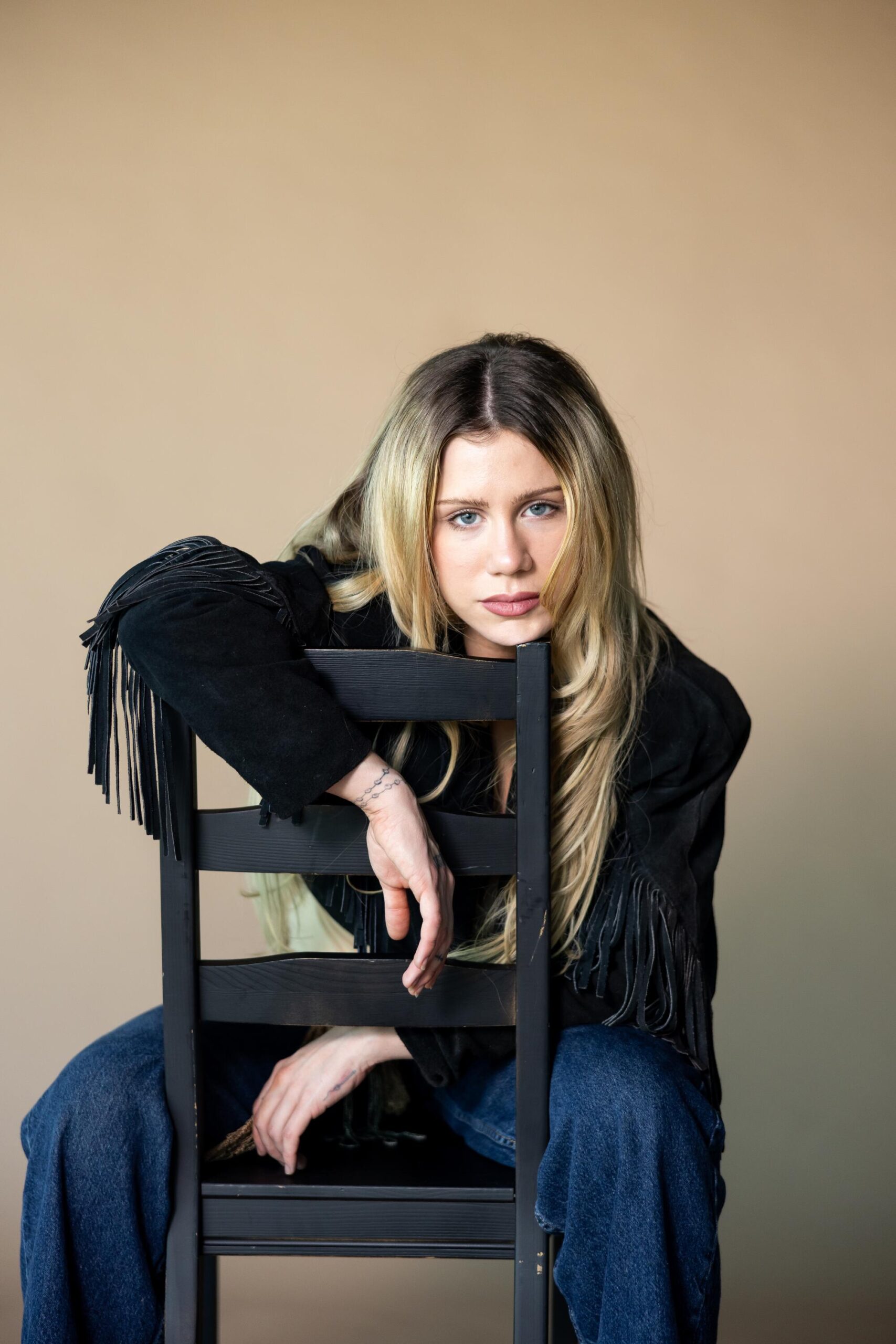 Outside The Times’ office, with highway and airplane traffic buzzing by on a cloudless afternoon, Slayyyter walked into our interview in Moschino kitten heels and her now-signature fringe jacket. Bubbly and friendly, she poked holes with her heels in the paper backdrop as she posed for portraits and gushed over Brittany Murphy’s 2003 film “Uptown Girls.” As the pictures flashed, I spotted an American flag in the room and suggested she use it as a backdrop to allude to the album.