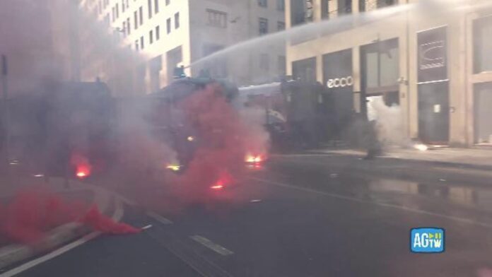 A Milano momenti di alta tensione tra la testa del corteo dei centri sociali e le forze dell’ordine. I manifestanti hanno lanciato petardi, bottiglie di vetro e fumogeni e gli agenti della polizia hanno risposto con gli idranti. Aggrediti con spintoni anche i giornalisti presenti per seguire la manifestazione.