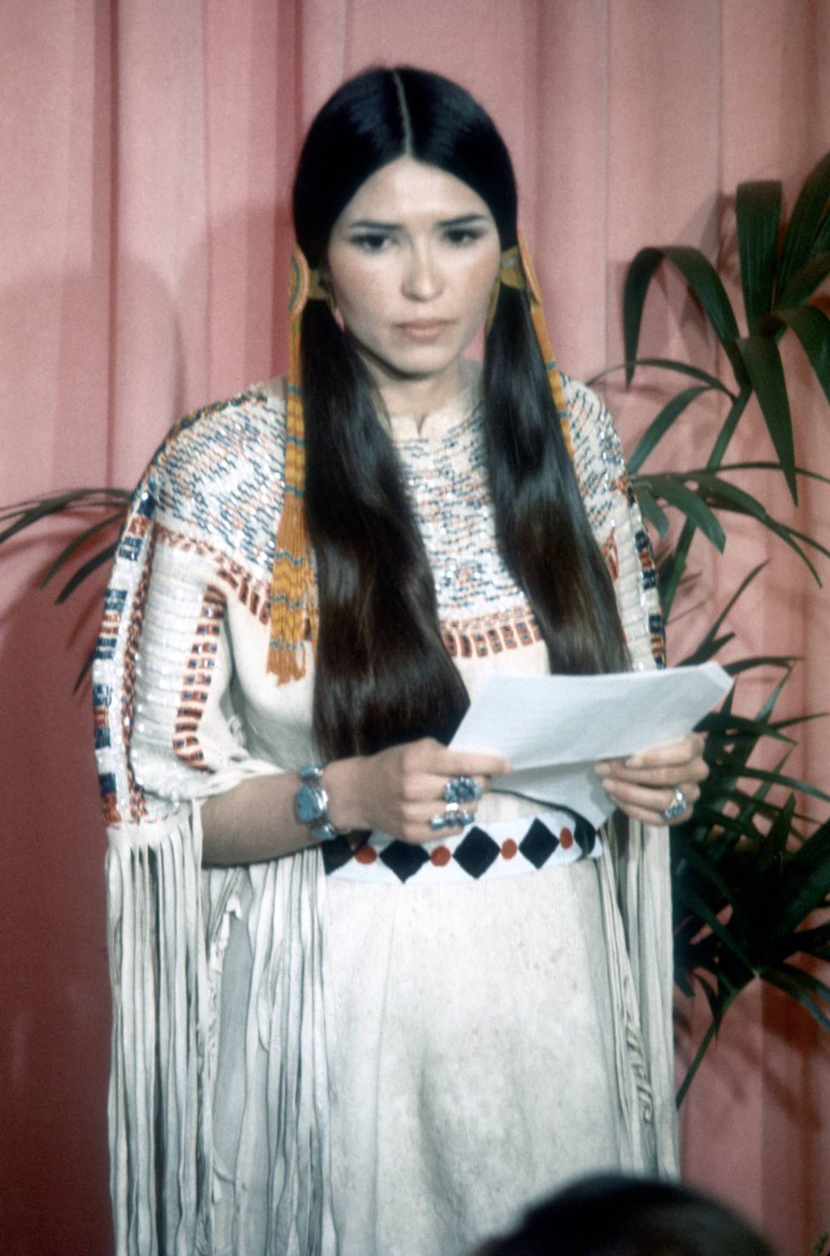 Dressed in traditional Apache attire, Littlefeather told those gathered: “He very regretfully cannot accept this very generous award. And the reasons for this being are the treatment of American Indians today by the film industry.”