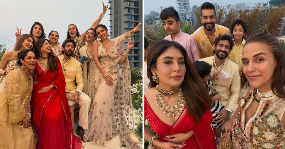 Neha Dhupia has shared some dreamy clicks from Gaurav Kapur and Kritika Kamra’s wedding. The photos show their entire friends circle, including Malaika Arora, Masaba Gupta, Rhea Chakraborty and more having a gala time with the bride and the groom at the wedding.