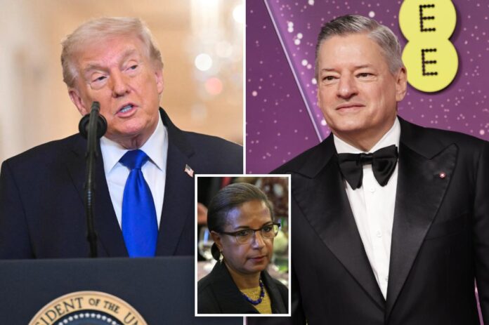 Netflix’s co-CEO Ted Sarandos brushed off President Trump’s demand to fire ex-Biden official Susan Rice from the streamer’s board — an exhortation that came as Netflix has been seeking to buy key parts of Warner Bros. Discovery.