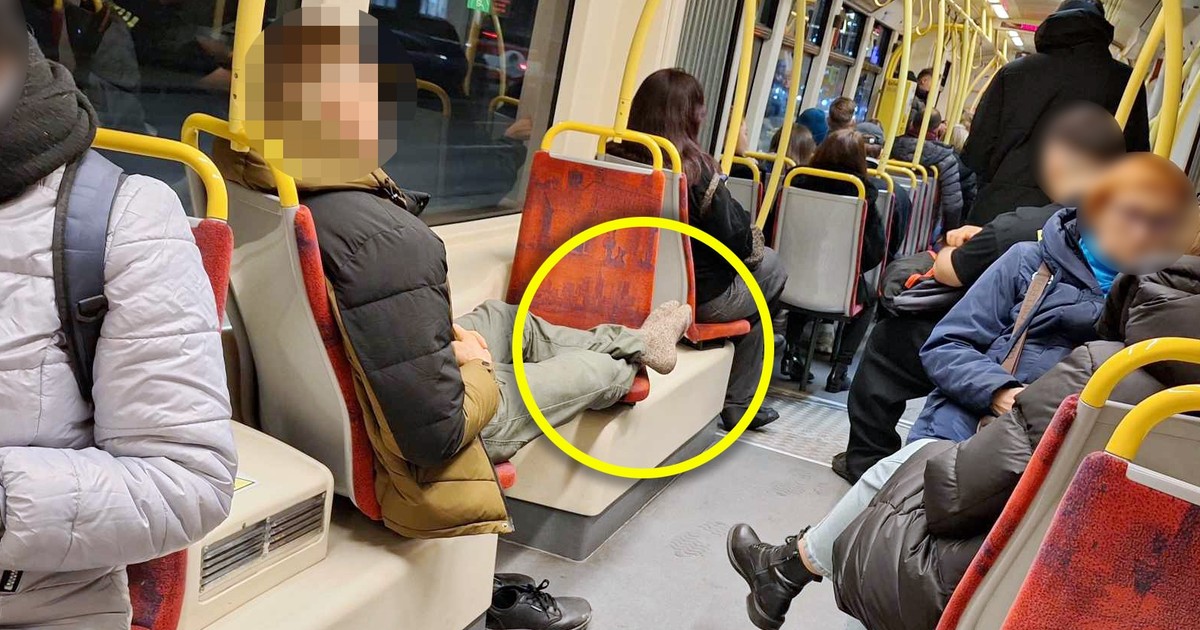 Niestety jak udokumentował reporter “Faktu” niektórzy pasażerowie nadal kompletnie nie zwracają uwagi na innych. W tym tygodniu, w jednym z tramwajów przyłapaliśmy mężczyznę, który zupełnie nie przejmował się współpasażerami. Mimo że ludzi był sporo, rozłożył się na dwóch fotelach. Zdjął buty, nogi kładąc na sąsiednim krześle. Zrobił to, chociaż obok stały osoby, które nie miały miejsc siedzących.