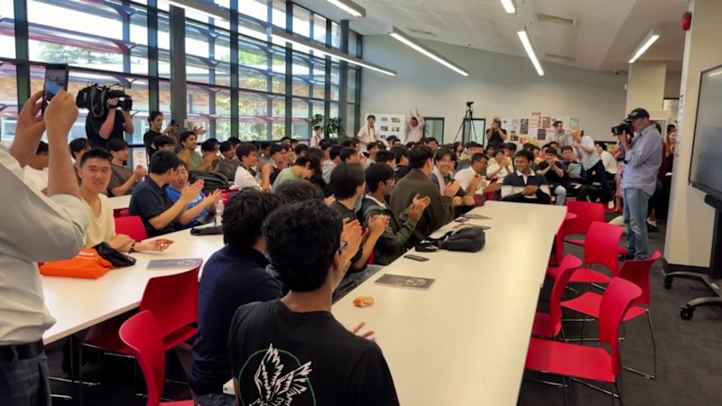 Students at North Sydney Boys High School celebrate after learning they had again received the highest proportion of top band results at an assembly on Thursday.