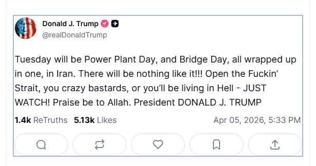 “Tuesday will be Power Plant Day, and Bridge Day, all wrapped up in one, in Iran. There will be nothing like it!!! Open the Fuckin’ Strait, you crazy bastards, or you’ll be living in Hell – JUST WATCH! Praise be to Allah,” Trump said on Truth Social, the microblogging platform owned by him