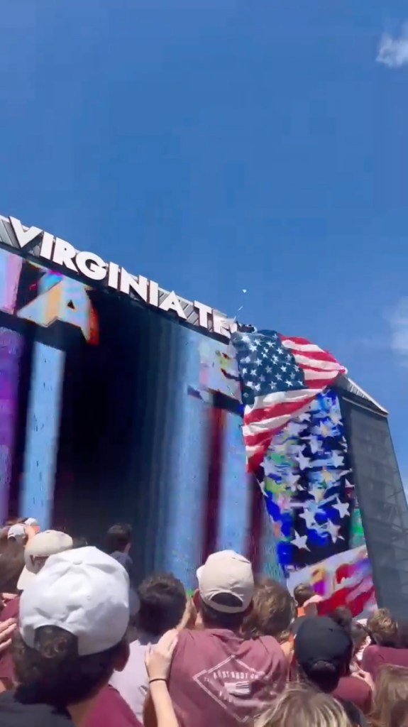 Terrifying footage shows two parachuters with American flags attached to them, gliding across Virginia Tech’s home football stadium.