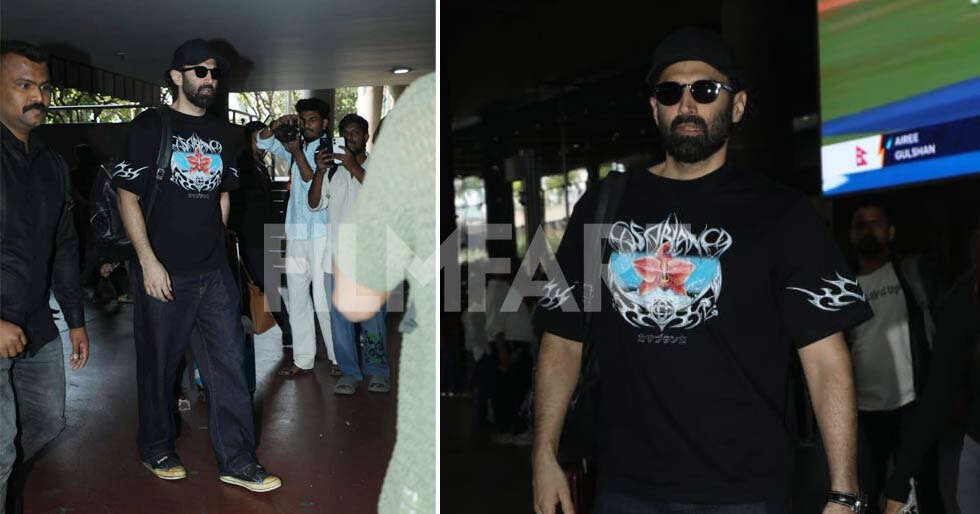 Aditya Roy Kapur was recently clicked at the Mumbai airport, looking effortlessly stylish. For his travel day, Aditya chose a relaxed outfit. He wore a black graphic t-shirt paired with classic blue denim jeans. To complete his signature casual look, he added a black baseball cap and dark sunglasses. Carrying a simple backpack, he took a moment to pose for pictures before heading inside the terminal.