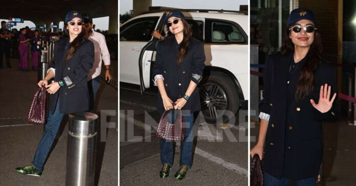 Rashmika Mandanna is in the news lately for her wedding rumours with Vijay Deverakonda. Amid this, the actress was clicked at the airport today, keeping her look sharp and easy. She paired a navy blazer with defined buttons, styled in a relaxed way with the sleeves folded up.
