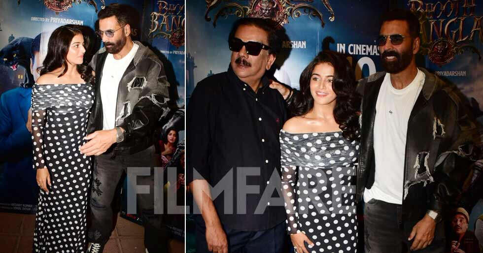 Amid the growing buzz for Bhooth Bangla, the stars of the film, including Akshay Kumar, Wamiqa Gabbi and more, alongside director Priyadarshan stepped out to promote the movie’s new song Tu Hi Disda. The celebrities were seen in monochrome colours, as they posed for the paparazzi.