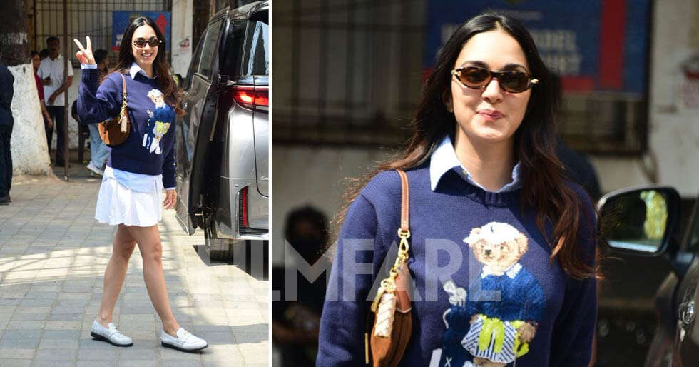 Kiara Advani was recently photographed in Mumbai in a cool and chic avatar. She paired a fitted white skirt with pleats with a blue shirt and comfortable blue pullover. She completed the look with brown shades and neat hairstyle with middle parting.