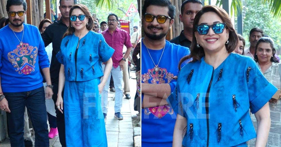 Madhuri Dixit Nene was snapped in the city on Friday,  12 December, looking effortlessly stylish in a striking blue two-piece co-ord set. The outfit featured a collared, short-sleeved cropped shirt adorned with bold black embellishments and embroidery, paired with matching wide-leg trousers that added elegance to her look.