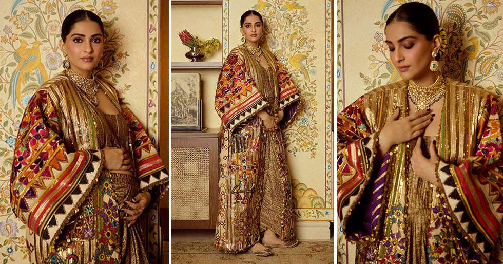Sonam Kapoor turned heads this wedding season as she shared a series of elegant photos showcasing her stylish maternity look. The mom-to-be wore a golden ensemble paired with a multicoloured shrug, carrying her baby bump with effortless poise. Her statement gold neckpiece and matching earrings added a refined touch, perfectly complementing her radiant glow.