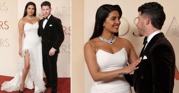 Priyanka Chopra Jonas and Nick Jonas looked oh-so-in-love while posing for clicks at Oscars 2026 or the 98th Academy Awards. PeeCee was seen in a white, strapless Dior gown which exuded elegance. It had gathered details around the waist and intricate feature details surrounding the thigh-high slit. Interestingly, Priyanka added some precious Bvlgari jewels, including a heavy necklace, to complete the look.
