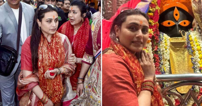 She was seen entering the premises of the temple. Inside photos and videos suggest that she performed aarti at the temple assisted by the priest. Interestingly, Rani was also photographed at the Mumbai airport while departing from Kolkata. She stepped out in a rust-red saree and opted for a minimal and effortless look. Elevating the ensemble with her signature sunglasses and a striking red bindi, she added a timeless charm to her subtle yet sophisticated appearance.