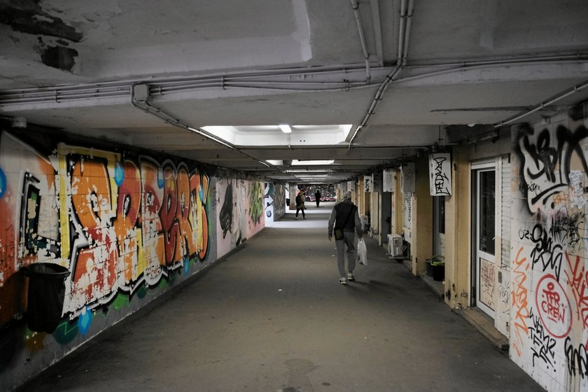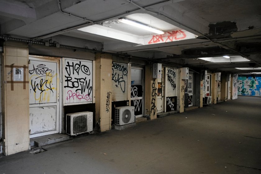 Jak czytamy w tekście, na pierwszy rzut oka pasaż sprawia wrażenie opuszczonego: pawilony są zamknięte, ściany pokrywa graffiti, a oświetlenie jest słabe. Jednocześnie uwagę zwracają elementy nietypowe dla przestrzeni nieużytkowanej — rozbudowany system monitoringu oraz bankomat ustawiony przy jednym z wejść.