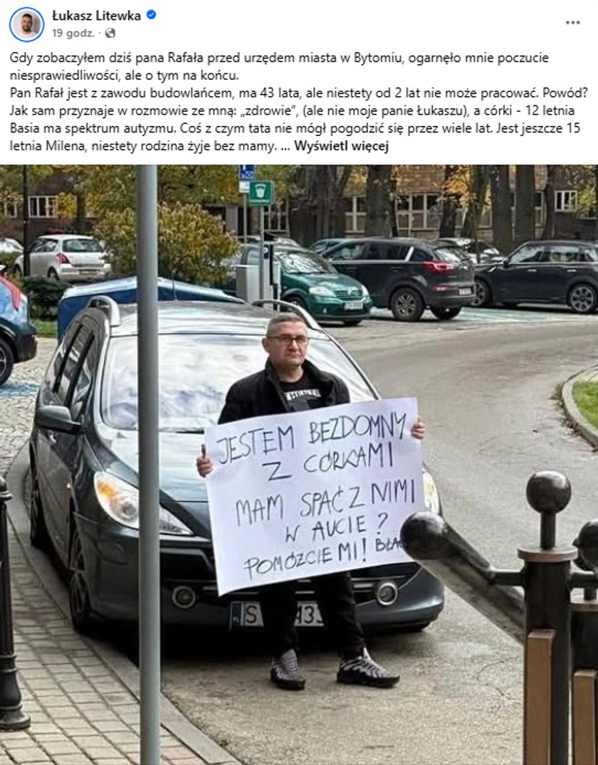 Pan Rafał jest budowlańcem. Samotnie wychowuje 15-latkę i 12-latkę, która jest w spektrum autyzmu. Mężczyzna rozwiódł się z żoną, jak ustalił “Fakt”, zasądzone ma 600 zł alimentów na dzieci, jednak była małżonka nie płaci regularnie świadczeń. W miniony wtorek (28 października) pan Rafał stanął przed Urzędem Miejskim w Bytomiu, trzymał plakat z napisem: “Jestem bezdomny z córkami. Mam spać z nimi w aucie? Pomóżcie mi! Błagam”. Sprawą zajęła się fundacja posła Łukasza Litewki, która zdeklarowała pomoc samotnemu ojcu i uruchomiła celową zbiórkę na zakup mieszkania.