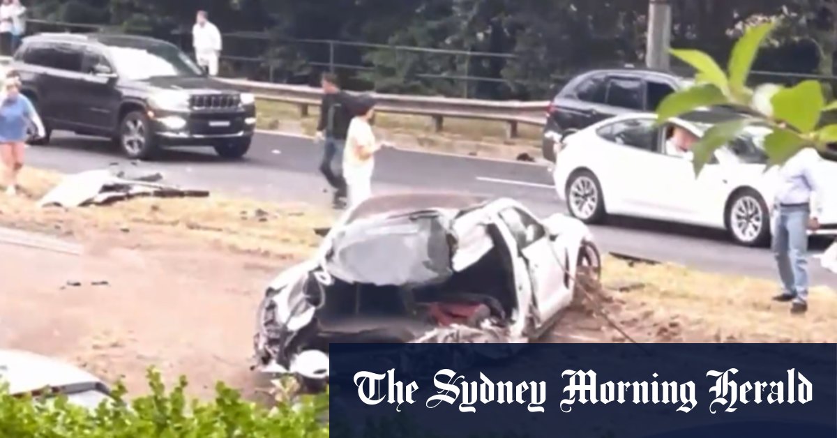 A Porsche has collided with two vehicles, causing one to flip over on a busy road on Sydney’s Upper North Shore.