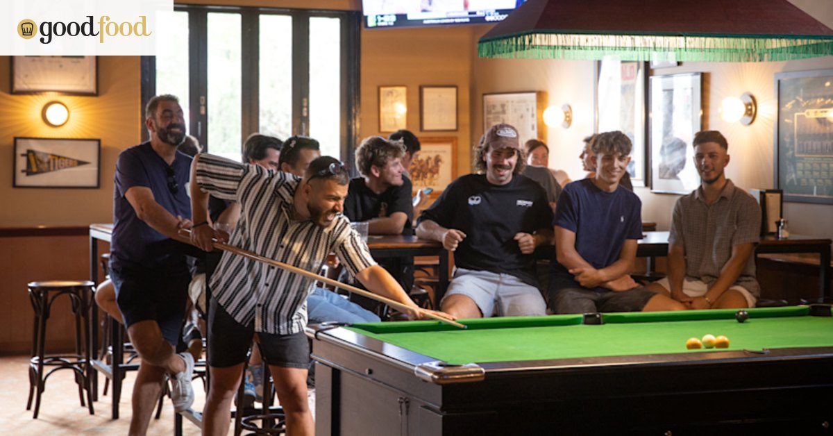 In the furthest reaches of Richmond, where the train meets the river, a divey old boozer is reskinned and reinvigorated for the Roaring ’20s. Timber panels, Carlton Draught taps, sport playing silently on screens. Young men in hi-vis bend the elbow out front. Inside, a tiled horseshoe bar sweeps across the room. Twentysomethings on dates perch at high tables. Pool balls clack under a fringed lamp.