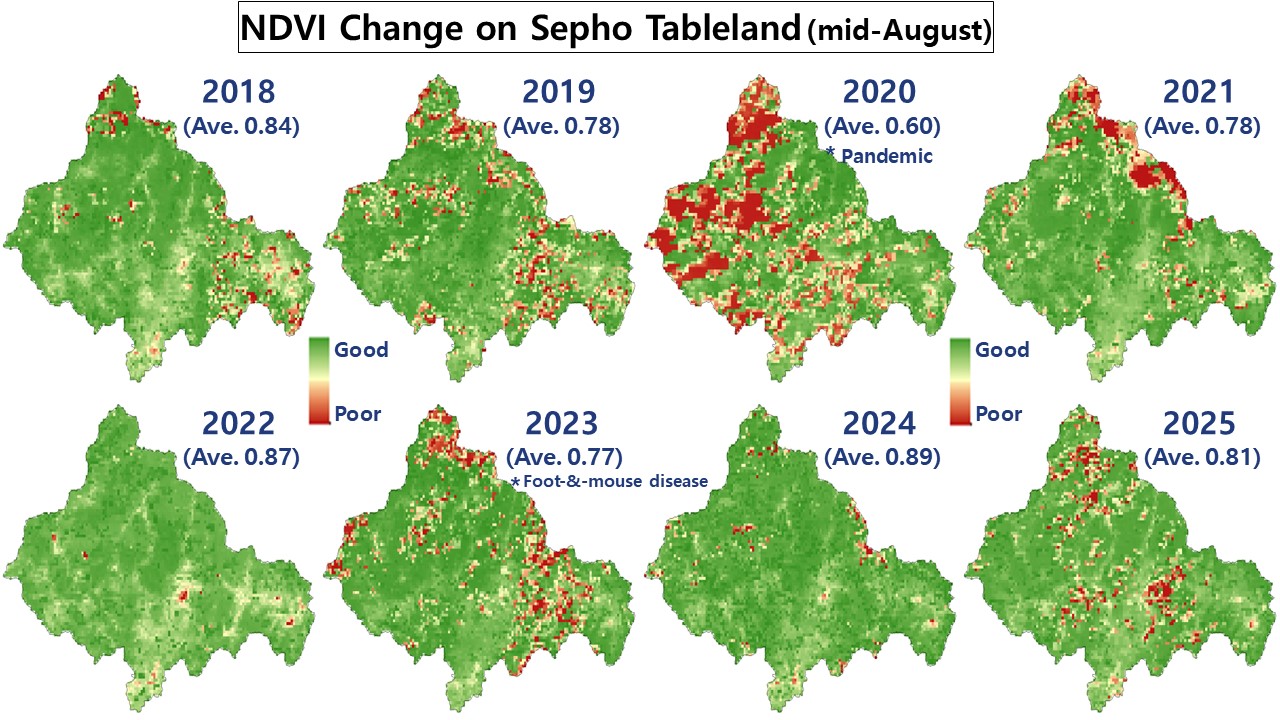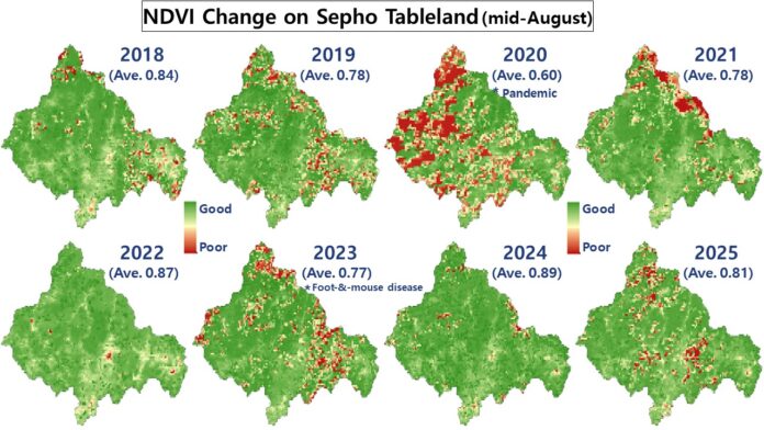 While conditions seemed to improve subsequently, foot-and-mouth disease outbreaks during three consecutive years (2021–2023) appear to have caused fluctuations in vegetation index values. The index fell to 0.77 in 2023 before apparently rebounding to 0.89 in 2024. But in 2025, the index decreased modestly to 0.81.
