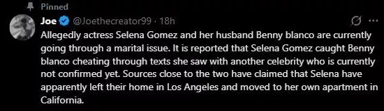 On the other hand, another post went viral a few days back. The post was dropped from the page named Hoops Crave, as per which Selena and Benny were heading for a divorce. To mention, this page is a self-proclaimed parody page, and thus, this statement was false. It all began with an alleged story from Selena Gomez’s profile. Several social media users claimed that a story allegedly from Selena’s social media made rounds, wherein she claimed herself to be single and later deleted the post. As per the claims, the note from that story could be read as: