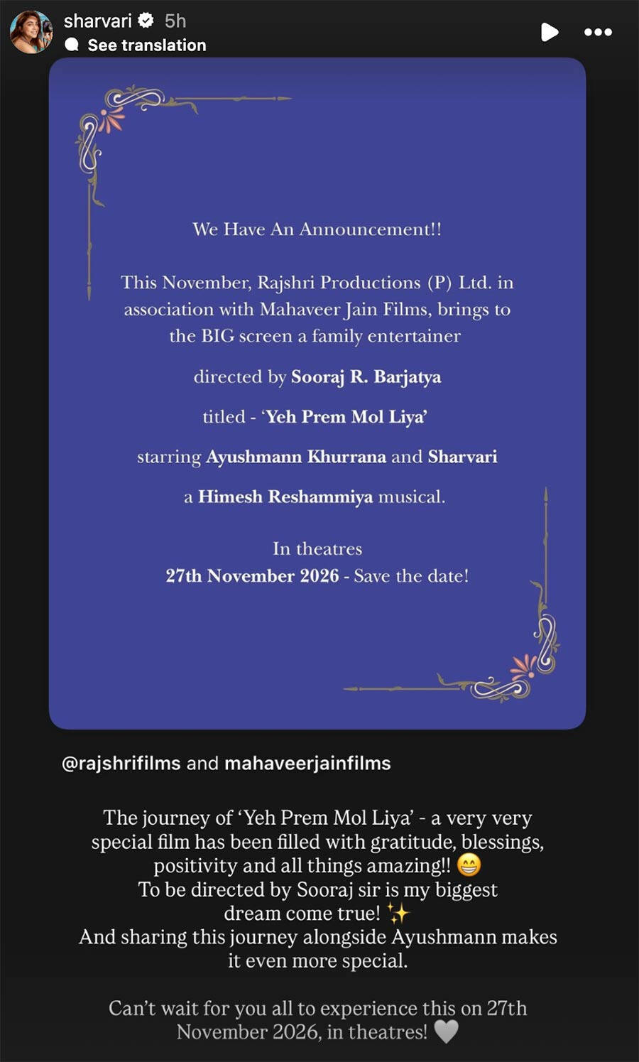 Recently, Sharvari took to her Instagram story and wrote, “The journey of ‘Yeh Prem Mol Liya’ – a very very special film has been filled with gratitude, blessings, positivity and all things amazing!! To be directed by Sooraj sir is my biggest dream come true! And sharing this journey alongside Ayushmann makes it even more special. Can’t wait for you all to experience this on 27th November 2026, in theatres!”