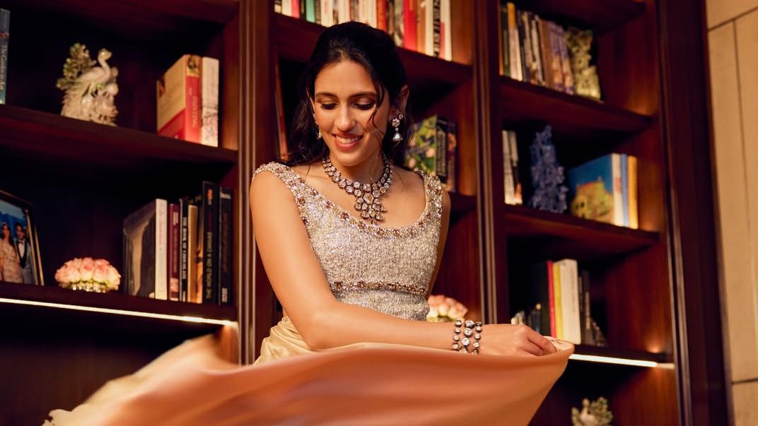 Her jewellery amplified the look’s high-octane glamour. She leaned into OTT diamonds, framed by a statement necklace that nodded to Art Deco geometry with its structured lines and tiered clusters. Matching drop earrings and diamond bracelets added further brilliance. On the other wrist, she juxtaposed her accessory look with a stack of classic kadas worn alongside a white timepiece. For beauty, she kept the focus balanced. Her hair was styled half-up, half-down and makeup remained minimal with defined eyes and a wash of peach gloss.