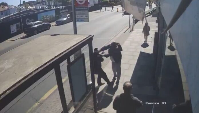 The terrorist pushes the victim against the bus shelter while stabbing him repeatedly during Wednesday’s terrifying attack in Golders Green, a heavily Jewish neighborhood in north London that an Iranian-backed group took credit for.