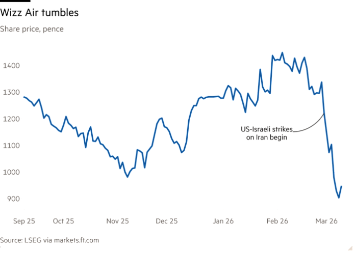 Shares in Wizz have fallen more than 20 per cent since the US and Israel began bombing Iran on February 28. That extended a decline of 14 per cent last month after the airline’s main shareholder, Indigo Partners, offloaded a near 10 per cent stake.