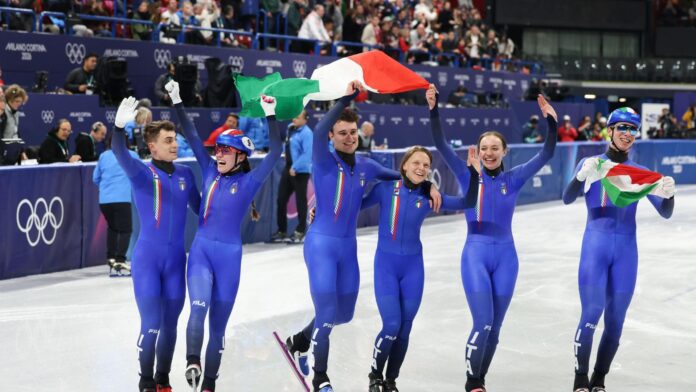 L’Italia è d’oro nella staffetta mista: Arianna Fontana, Pietro Sighel, Thomas Nadalini ed Elisa Confortola (oltre a Luca Spechanhauser e Chiara Betti, sul ghiaccio nel primo turno e nel secondo turno), ed ecco che il capolavoro è compiuto. Gli azzurri, già argento a Pechino 2022, hanno scritto a piene mani la storia. Con le donne ad aprire la gara con due frazioni a testa e con Sieghel a chiudere e a portarci in trionfo. Una giornata che resterà scolpita nello short track italiano e anche nella mente e nel cuore di Arianna Fontana che ha conquistato la dodicesima medaglia olimpica della carriera, ora ad una sola dello schermidore Edoardo Mangiarotti che con 13 detiene il record azzurro.