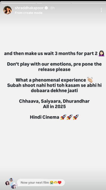 Ranveer Singh, Akshaye Khanna-starrer Dhurandhar justifies its title. The film has been a Dhurandhar at the box office, and now Shraddha Kapoor has also celebrated its blockbuster success. On her Instagram stories, the Stree actress congratulated the team and expressed her thoughts about the film. After finishing the movie, Kapoor revealed that if she hadn’t had a shoot the next day, she would have watched the next show as well. The Aashiqui 2 actress also demanded that the makers postpone the Dhurandhar Part 2. Like millions of other moviegoers, even Shraddha can’t hide her excitement for Part 2.
