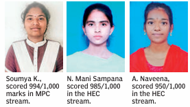 N. Mani Sampana from the Government Junior College at Palvancha secured 985 out of 1,000 in the HEC stream. Even though her father, a government gurukul English teacher, could afford private education, he chose a government college for her. He believes that government colleges are as good as private ones and that their teachers are highly knowledgeable. Sampana said results in the Intermediate Public Examinations show that several students who pursued intermediate in government-run junior colleges achieved stellar success.