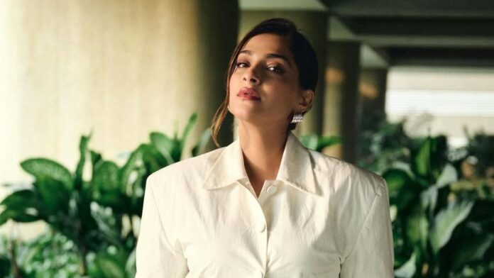 Rakul Preet Singh opted for a two-piece ensemble from Maison Amali. She paired a cropped jacket—embroidered with an embellished droplet pattern and finished with a curved silk collar—with a fluid draped silk maxi skirt. The structured silhouette was styled with diamond earrings, stacked rings, soft glam makeup and a sleek half-up hairstyle.