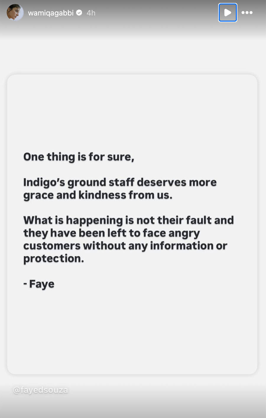 Bhool Chuk Maaf Wamiqa Gabbi shared journalist Faye DSouza’s post that read, “One thing is for sure, Indigo’s ground staff deserves more grace and kindness from us. What is happening is not their fault and they have been left to face angry customers without any information or protection.”