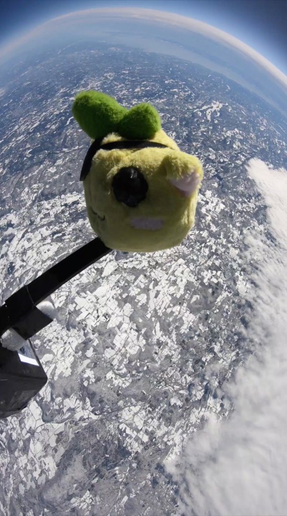 Emy, a fluffy, 9-ounce, yellow and green creature, traveled 116,419 feet over Kingston, NY, on March 4 via a high-altitude balloon and gently fell back to earth after the balloon popped.